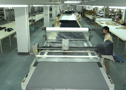 公司采用CAD計算機輔助排料系統進行排料,該系統準確、高效。鋪料機代替手工鋪料的優點使鋪料均勻、整齊、松緊適宜、降低工人勞動強度。